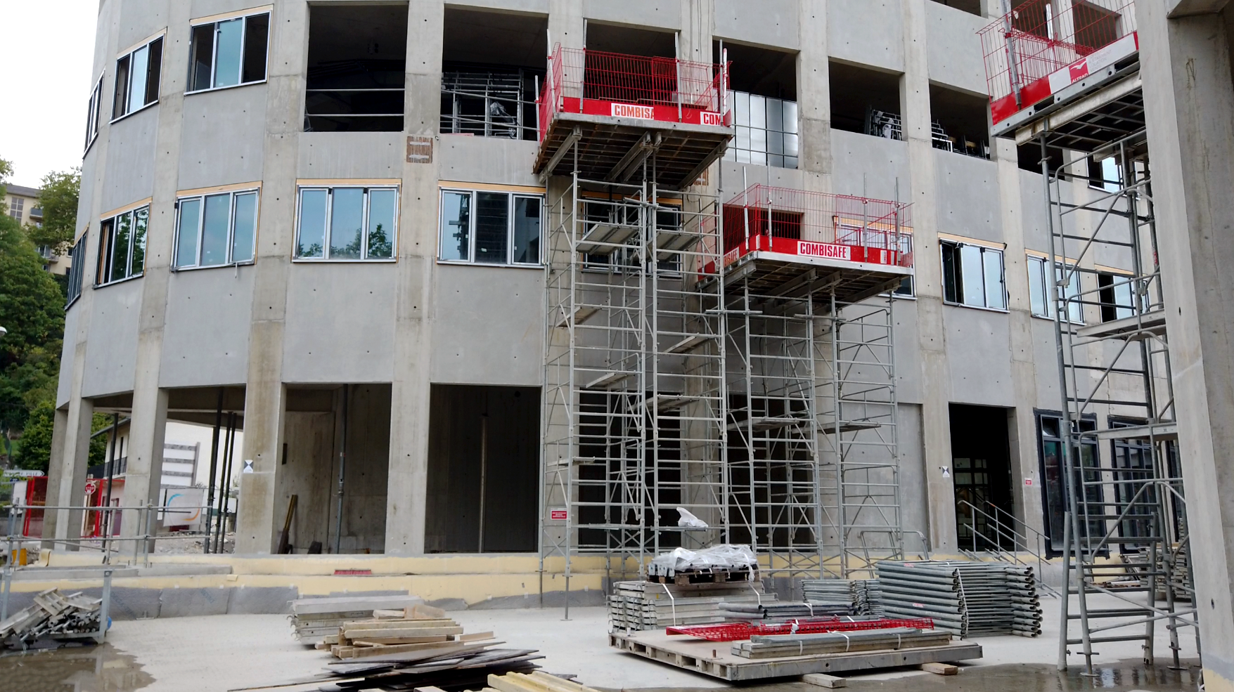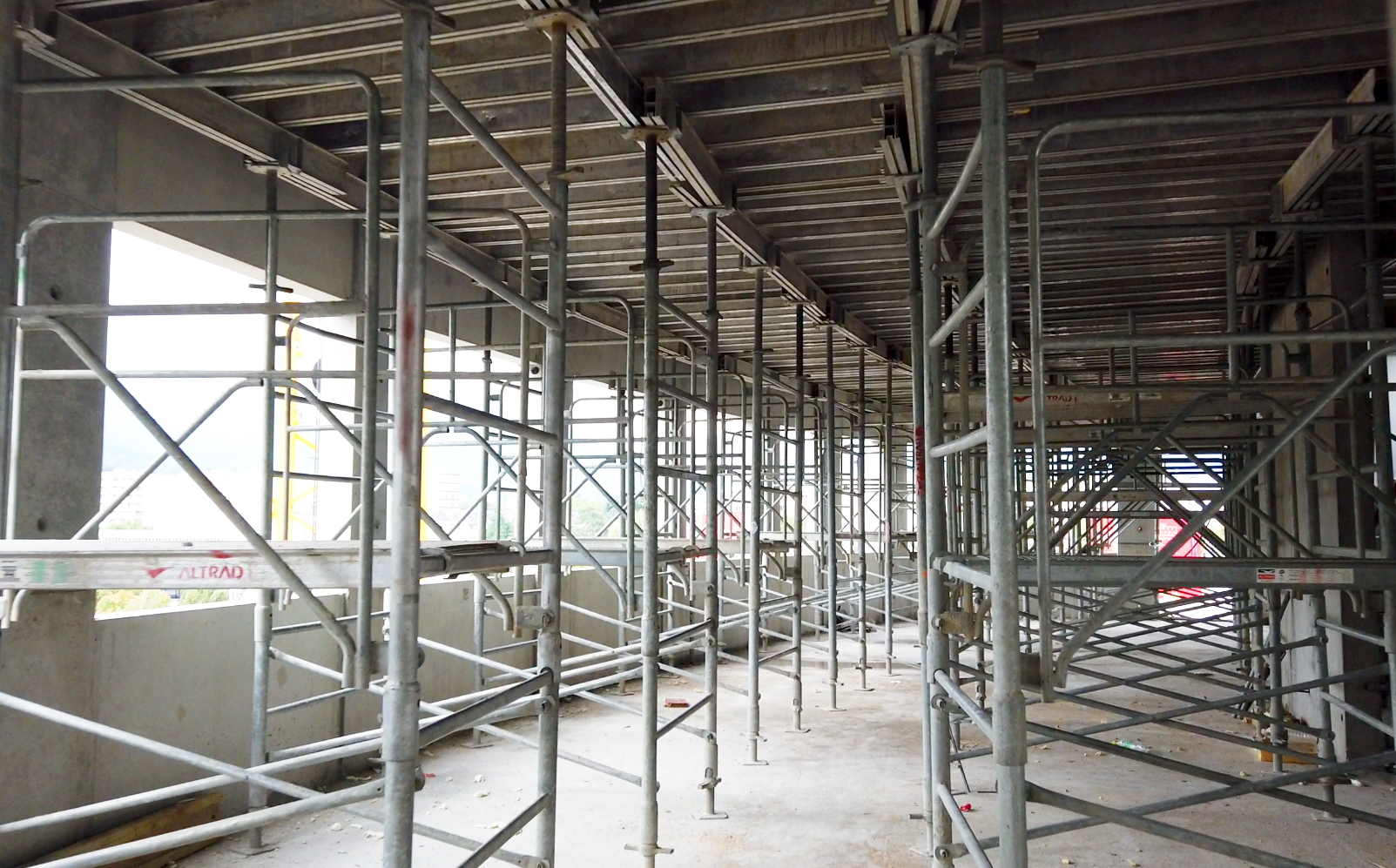 - The superstructure area: we carried out around 12,000m² of formwork, using ASE 120 towers (100 units + aluH16 beam). We have also adapted to the curved shape of the building to form 3.3 to 4 meters high with a rate of 400m²/week.