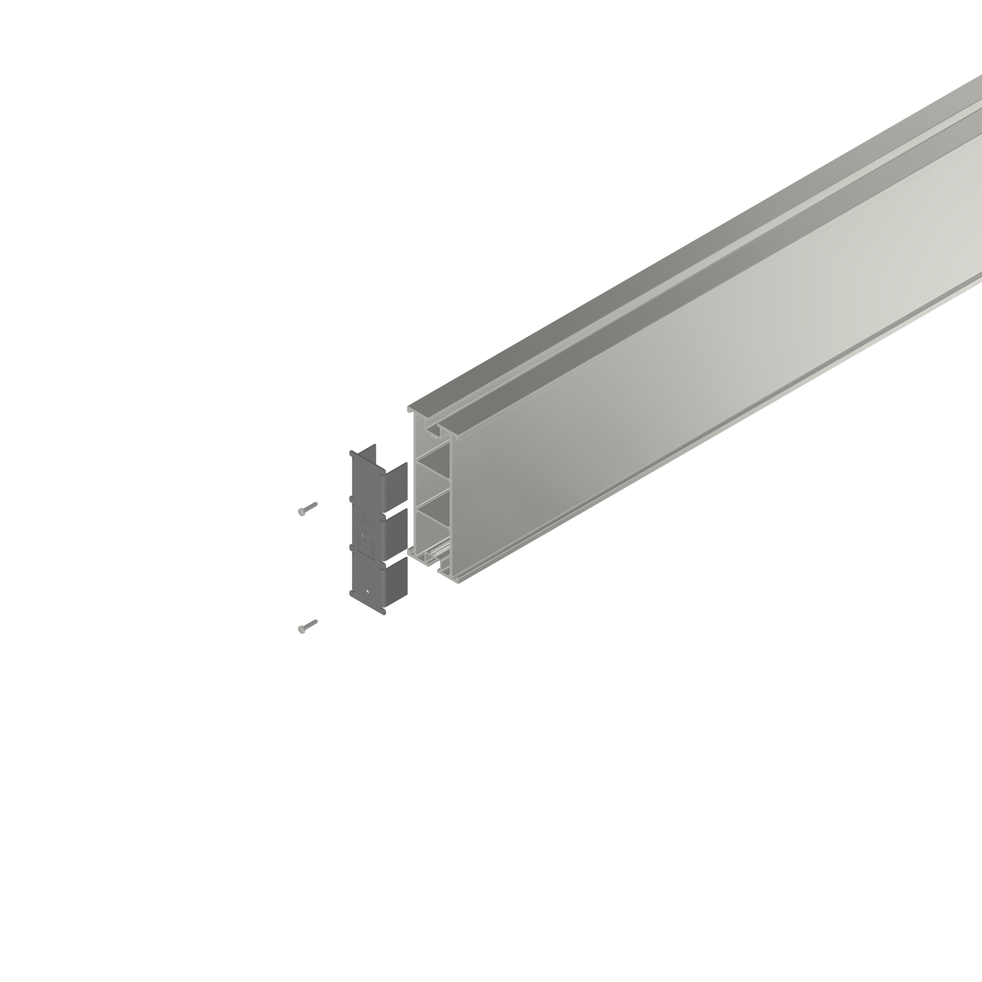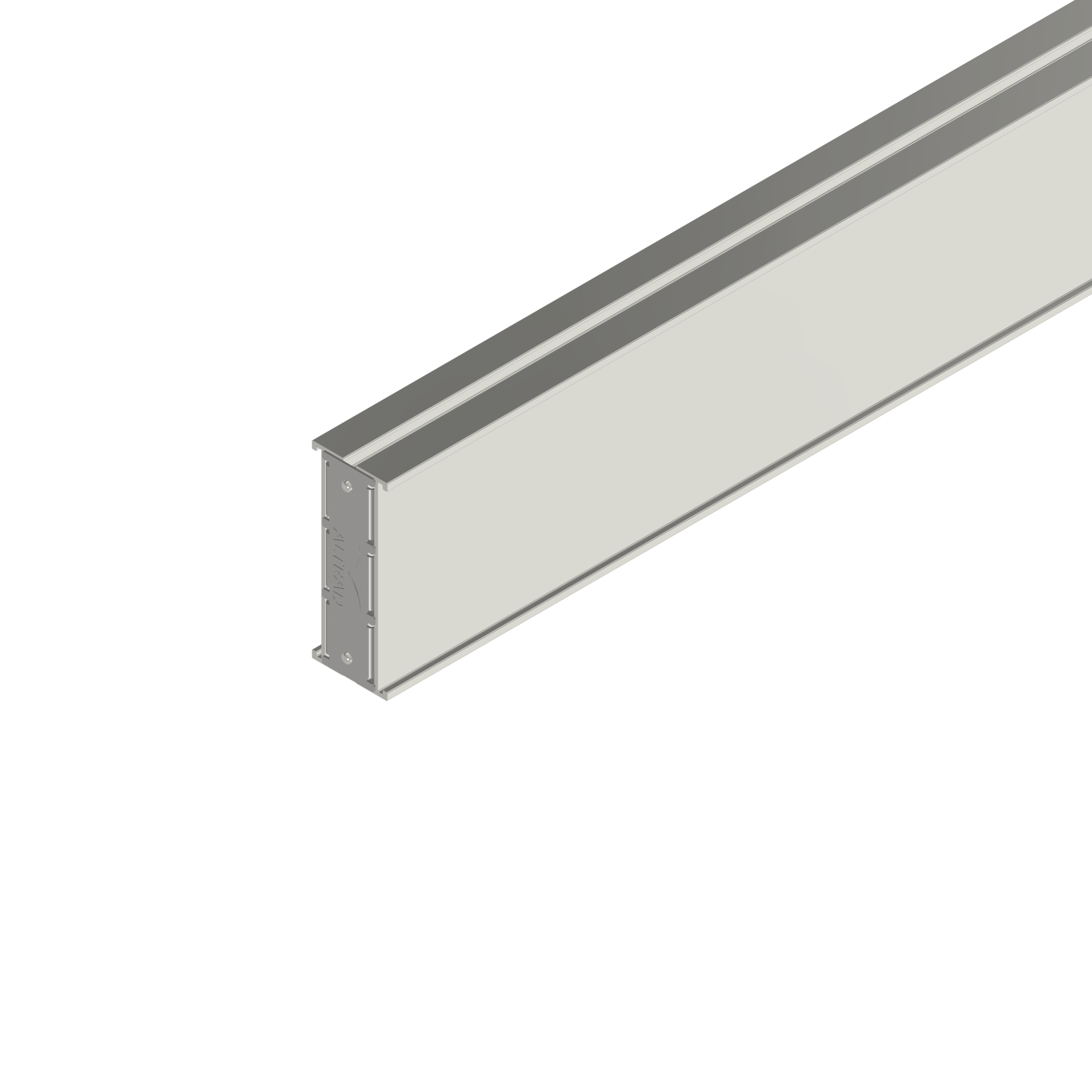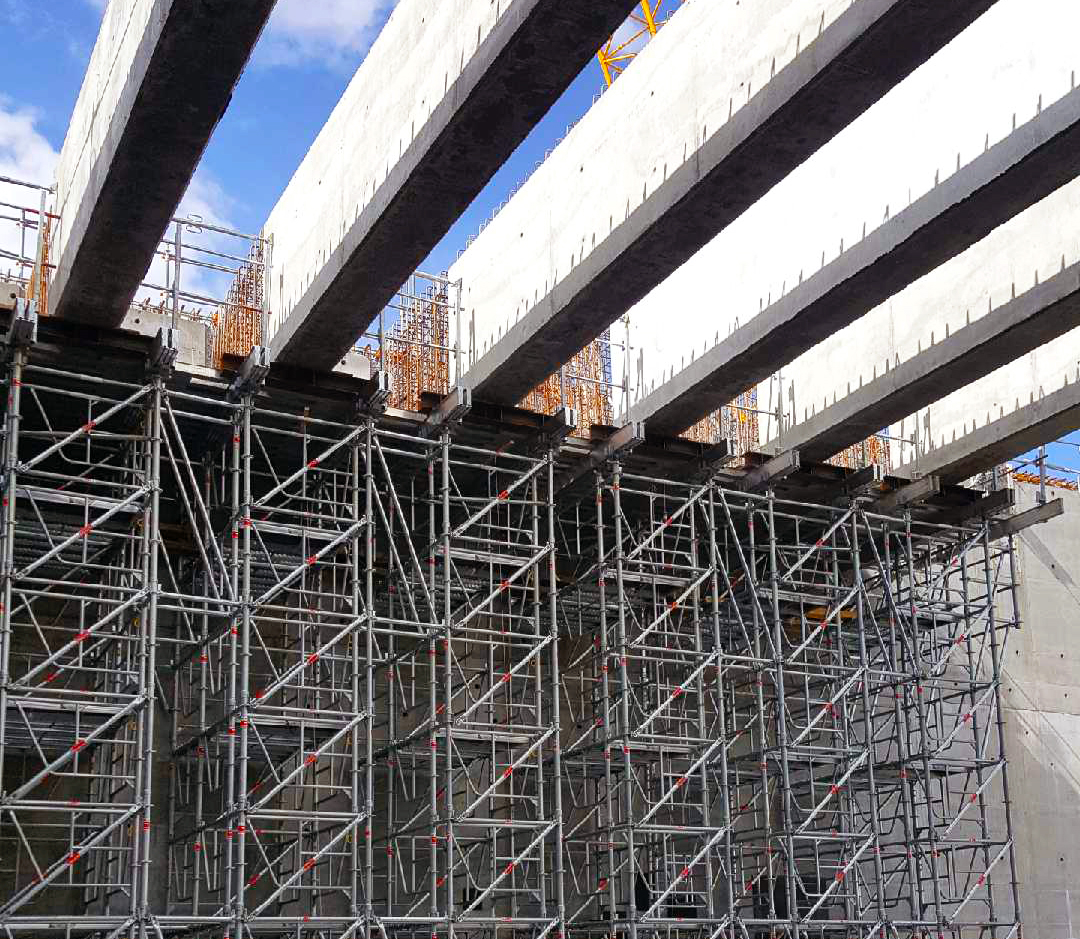 Beam equipped with galvanised metal plugs at the ends serving as reinforcements and fixed by means of an Alveovis system guaranteeing the good holding of the plugs in intensive use. A rail is present on the 2 flanges of the beam in order to be able to use "Clamps" fixed by hammer head bolts. The aluminium alloy used has a yield strength characteristic equivalent to that of steel.