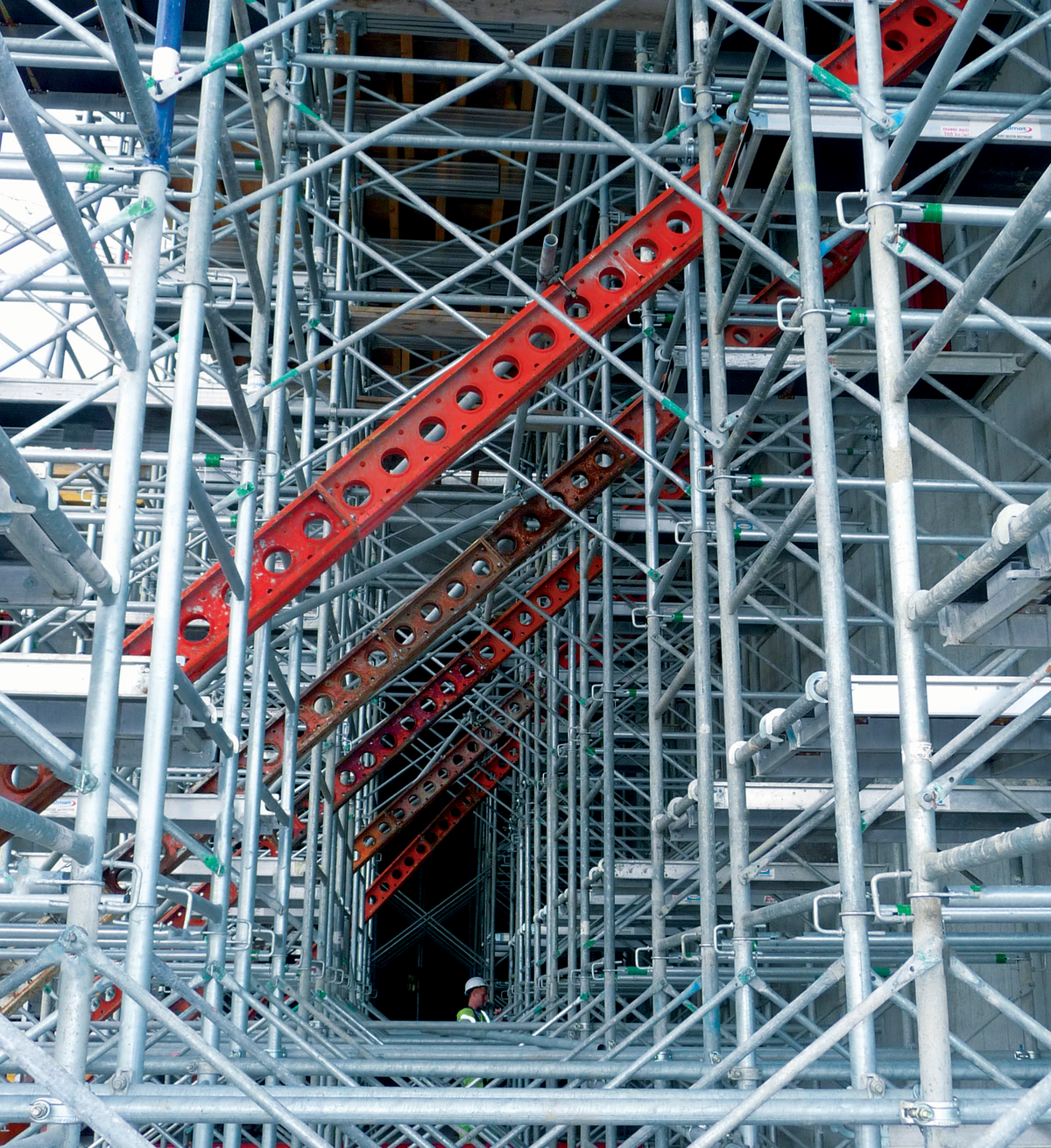 The STAFLEX multidynamic shoring tower ensures the most ergonomic possible assembly and the realisation of shoring with traffic decking between the towers.