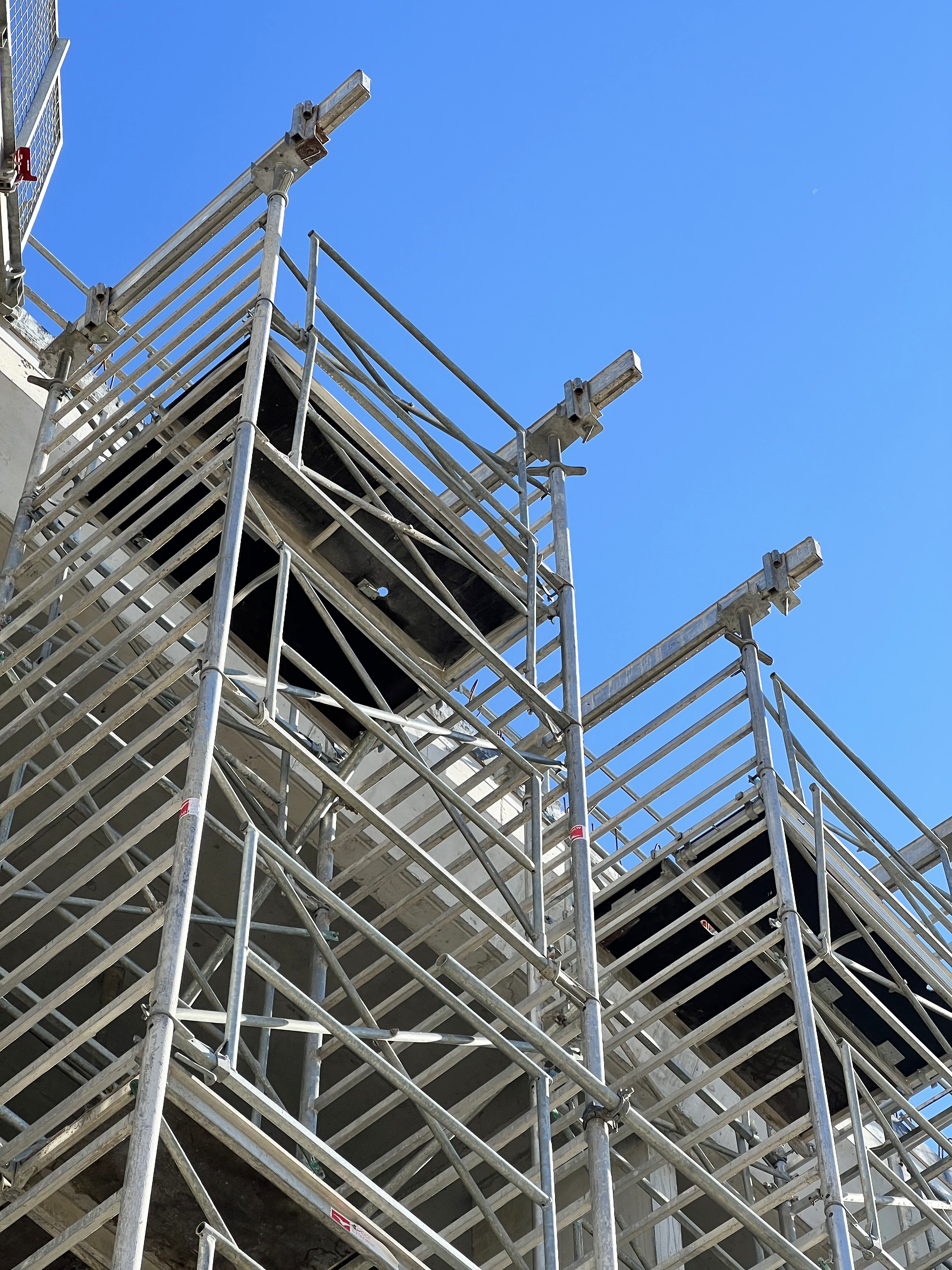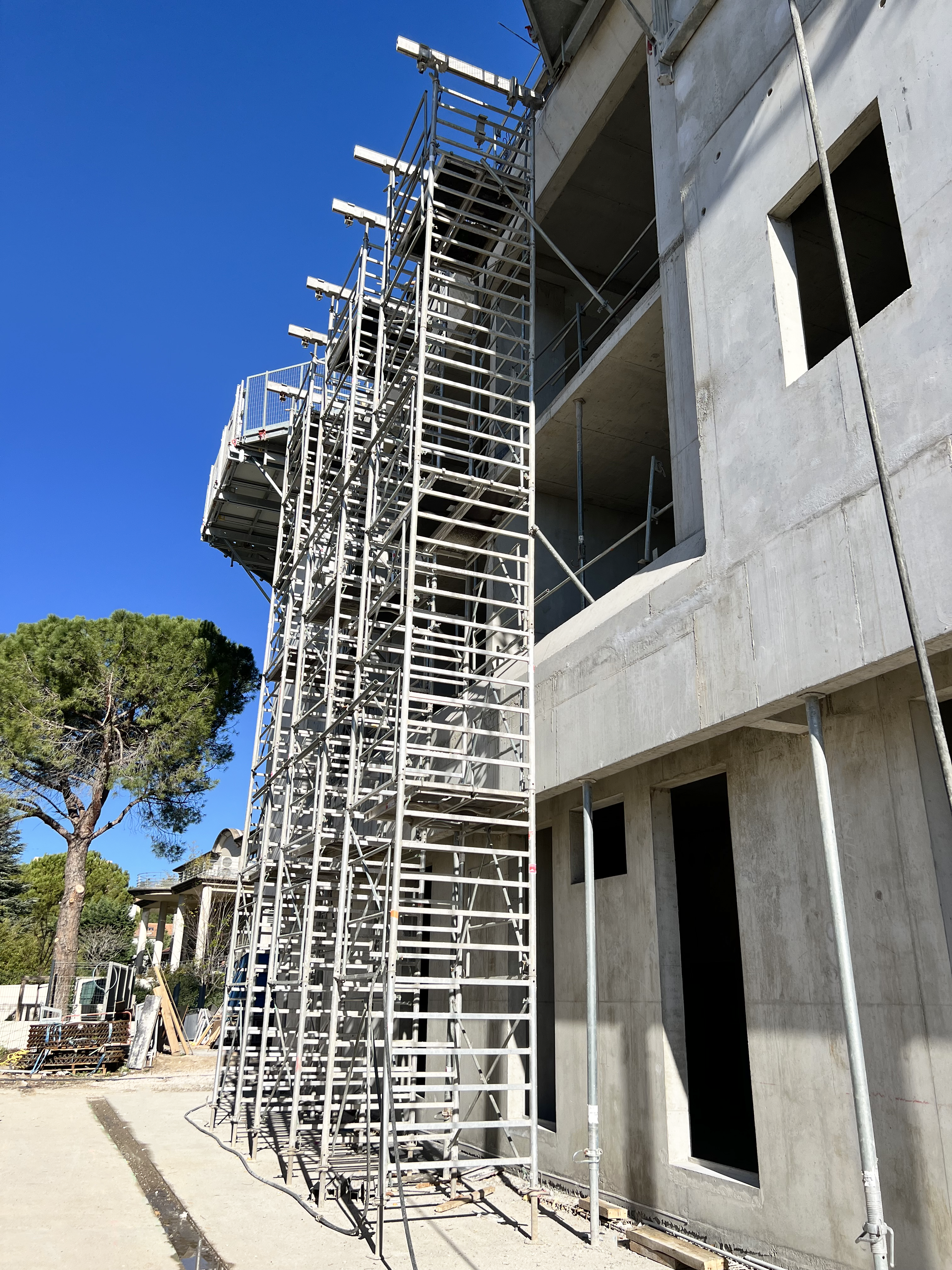 Pendant plus d'un an, nos équipes ont mis en oeuvre des tours d'étaiement Staflex aluminium soit 75 tonnes de matériel pour le coulage de prédalles à des hauteurs de plus de 4 mètres et pour la réalisation de poutres périphériques au rez-de-chaussée.