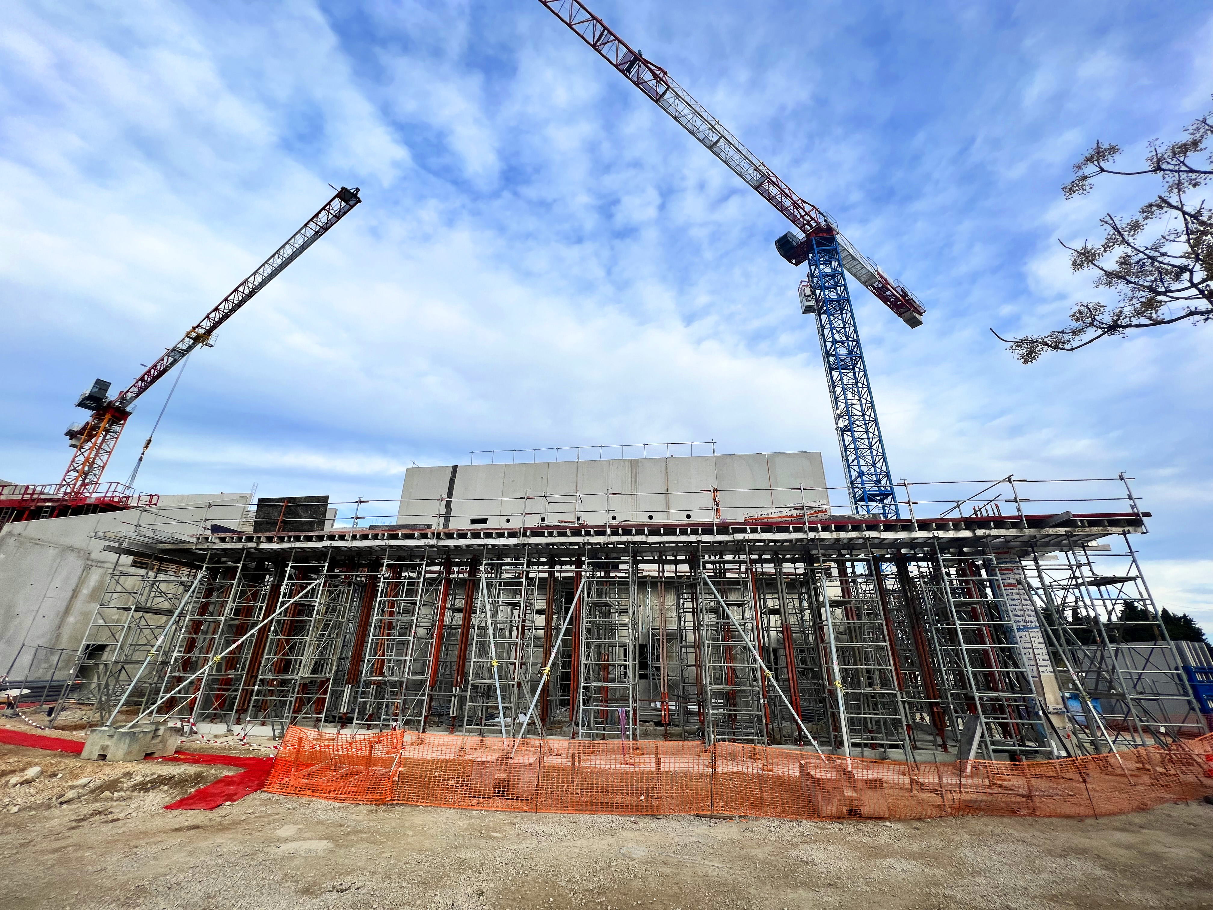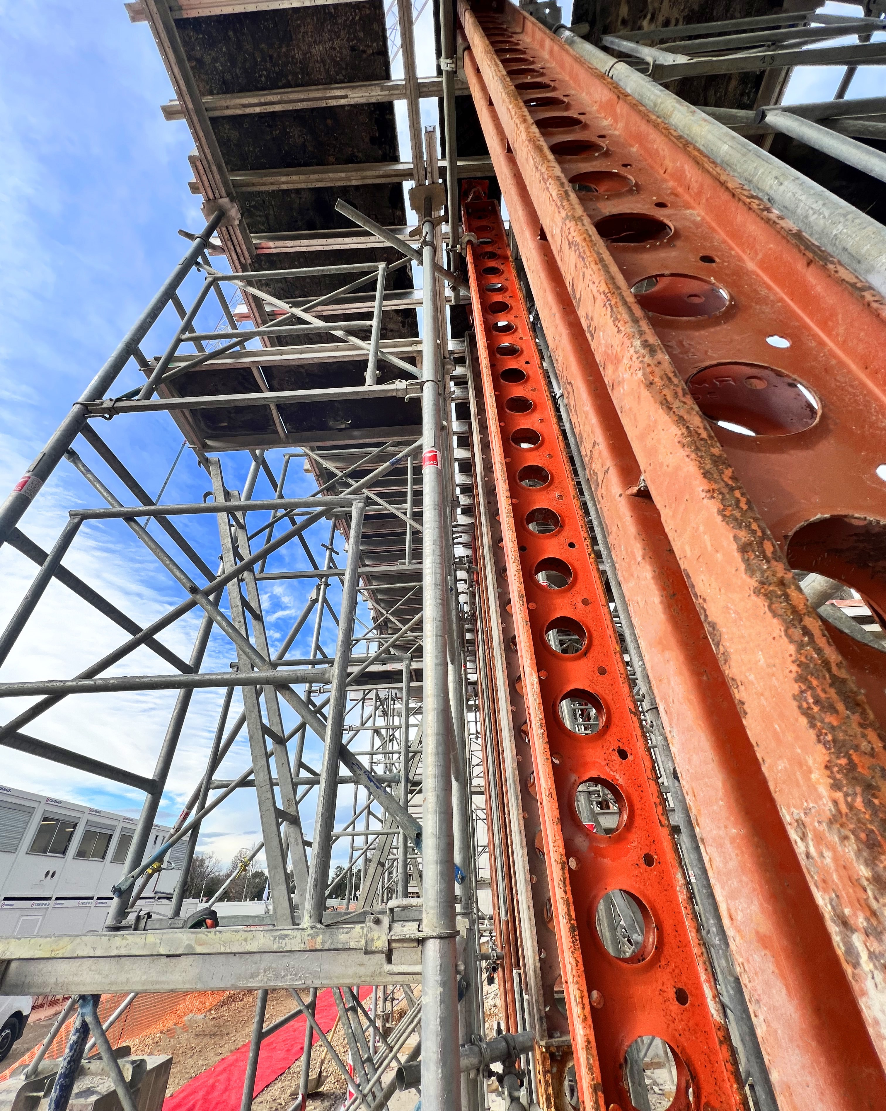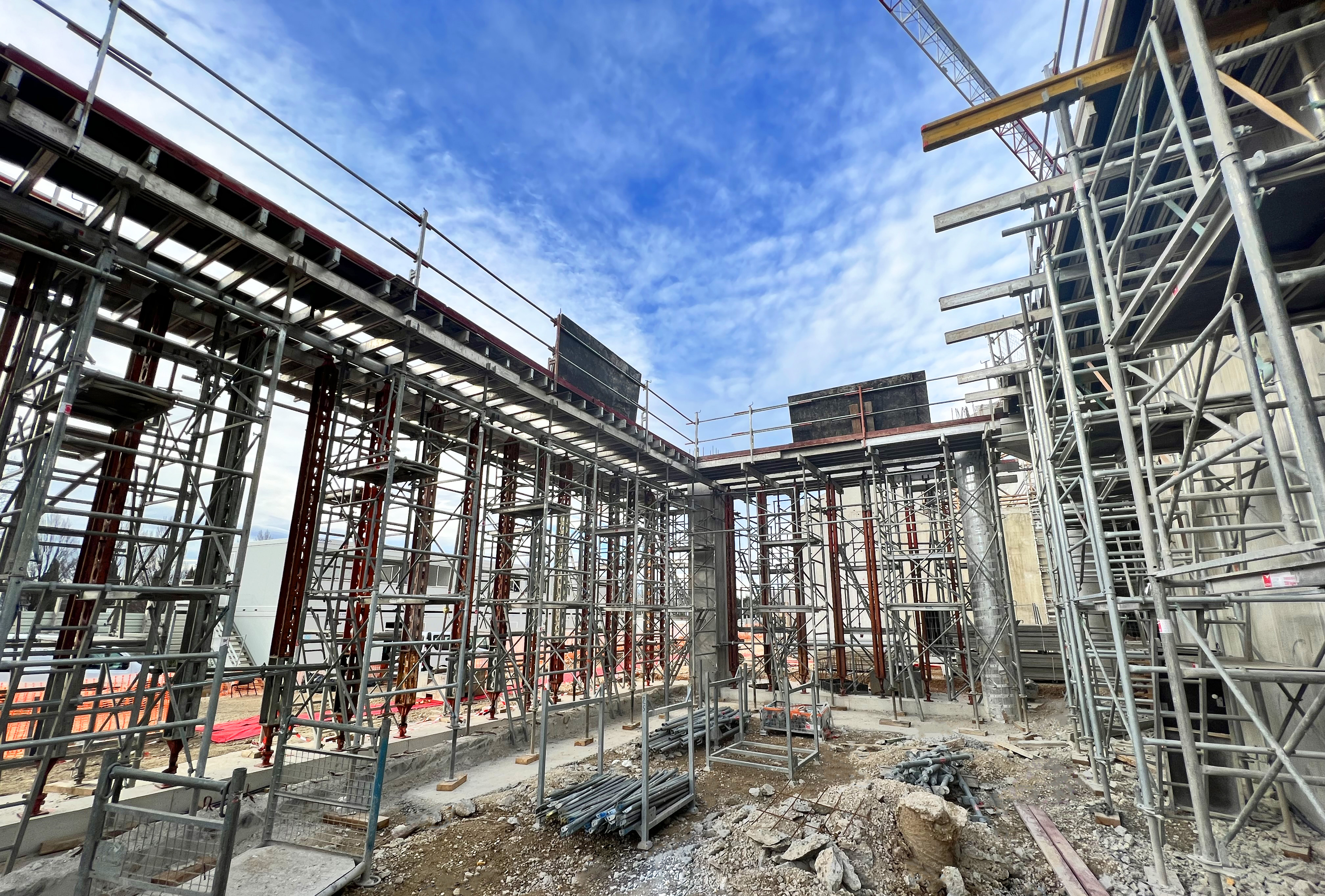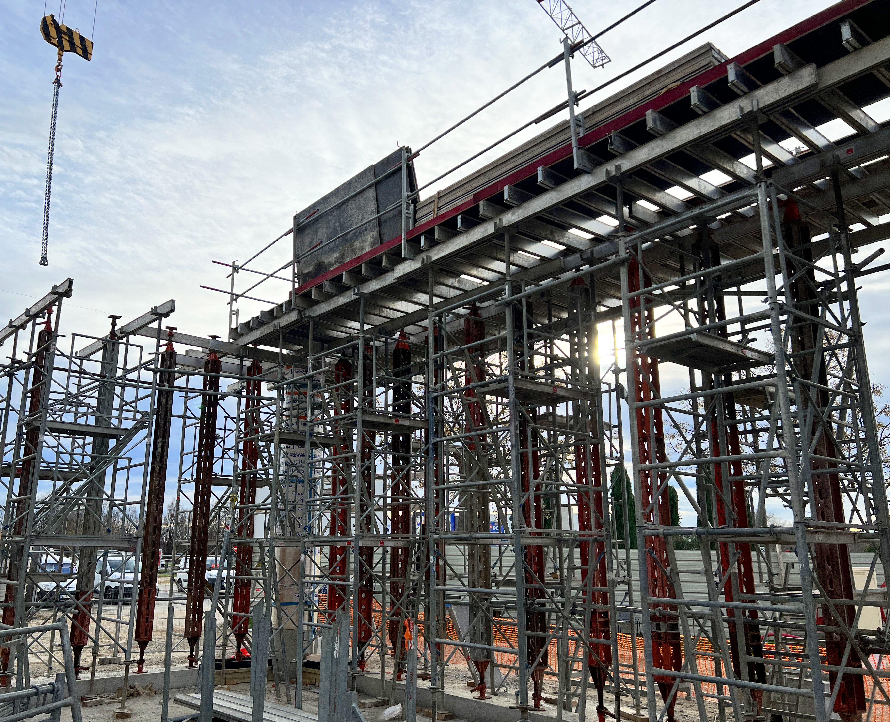 Nous avons livré et loué plus de 40 tonnes de matériel composé de tours d'étaiement Staflex et d'étaiement lourd Slimshor. La principale caractéristique technique de ce chantier réside dans le coffrage d'une dalle Alvéo d’une portée de 11ml et d’une épaisseur de 41cm. Dans le même temps, il a fallu reprendre une poutre coulée en place de 40x98 de haut et un voile coulé en place de 8m02 avec des banches métalliques de 8m40 de haut.