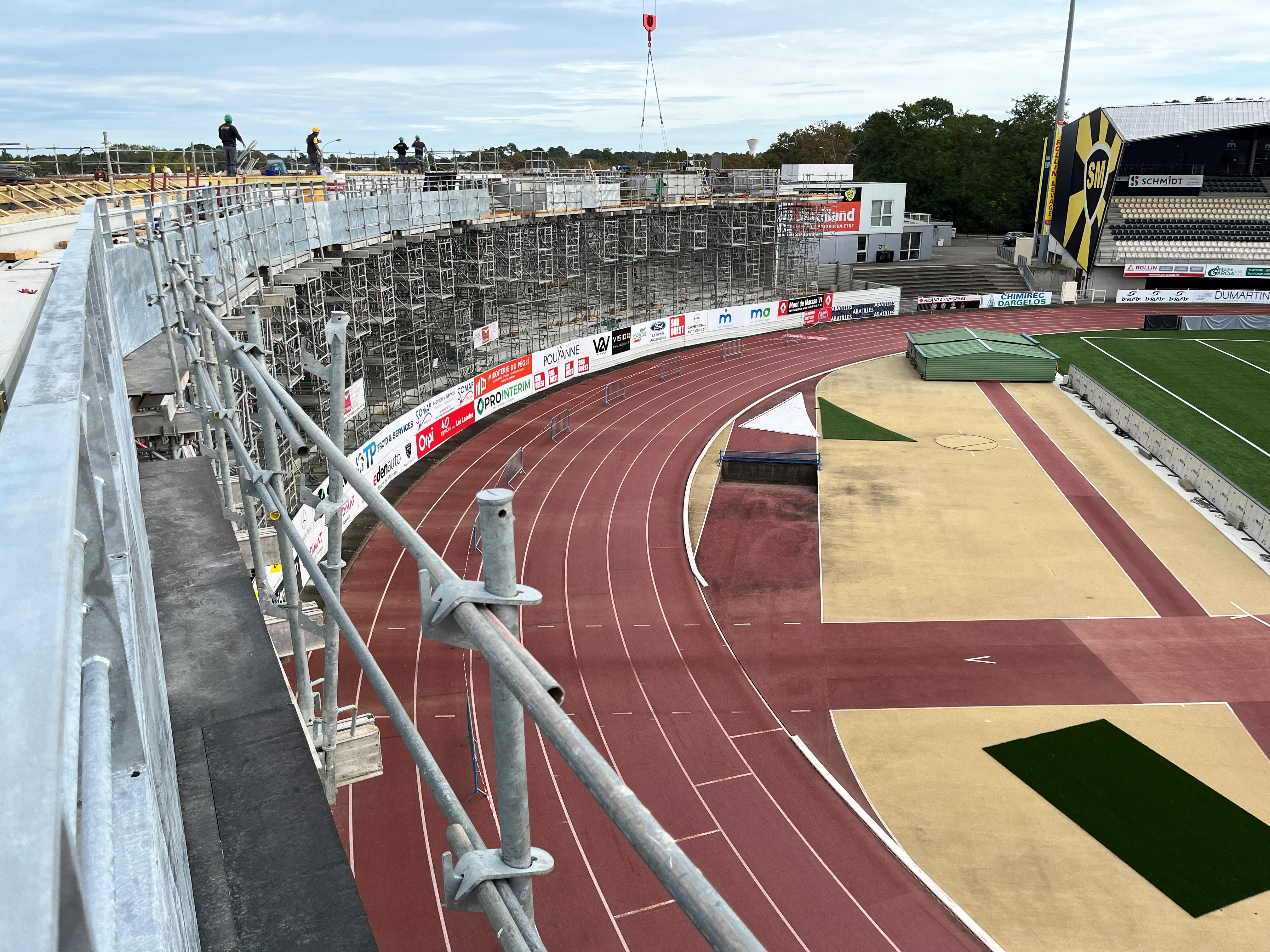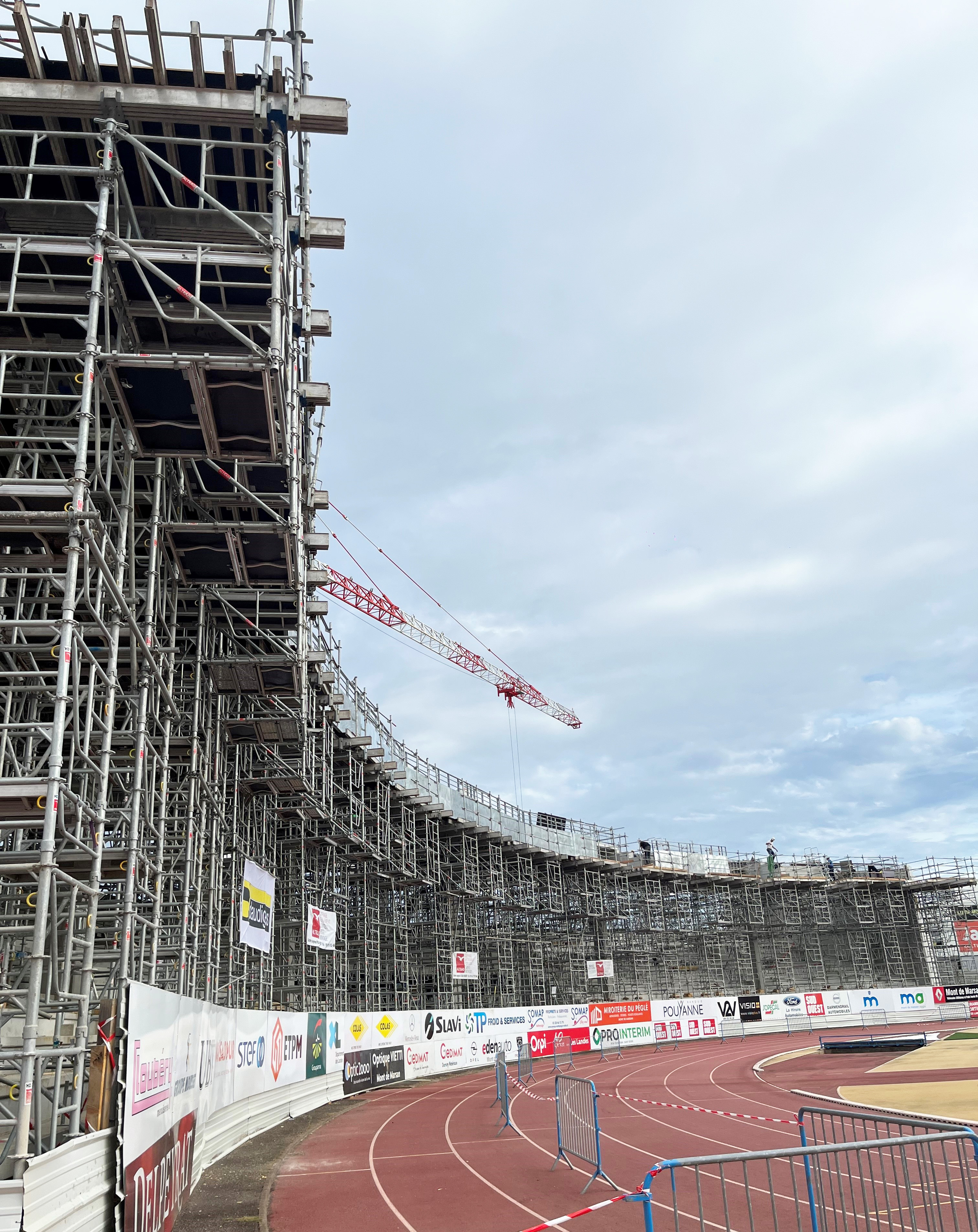 Notre bureau d'étude a effectué un travail précis pour répondre aux enjeux du chantier qui a nécessité la mise en place d'un étaiement en console à 8 mètres de haut pour éviter les appuis des tours d'étaiement sur la piste d'athlétisme. Par ailleurs, nos équipes ont eu le plaisir de voir l'équipe du stade Montois qui évolue en Pro D2 s'entraîner !
